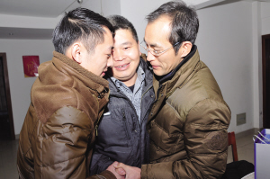 相見時,李成學、靳麗峰緊緊擁住救人“胖哥”陳建華(中),連連道謝。