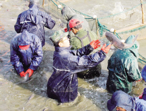 苦和累的除了捕魚外,還有就是夏天大雨后張網(wǎng)攔魚。吳勇說,雨下大了,魚塘可能出現(xiàn)大水漫堤的險情,魚會隨水逃跑,所以一到這種天氣,大家就特別緊張,只要接到電話,不管是半夜還是凌晨,都會馬上趕到養(yǎng)殖場,去年就曾在凌晨2時多趕過來,和大家一起在塘中拉起了一張張網(wǎng),好在今年年初,養(yǎng)殖場對內(nèi)外堤都進行了加固,月初的大雨才沒有發(fā)生險情。