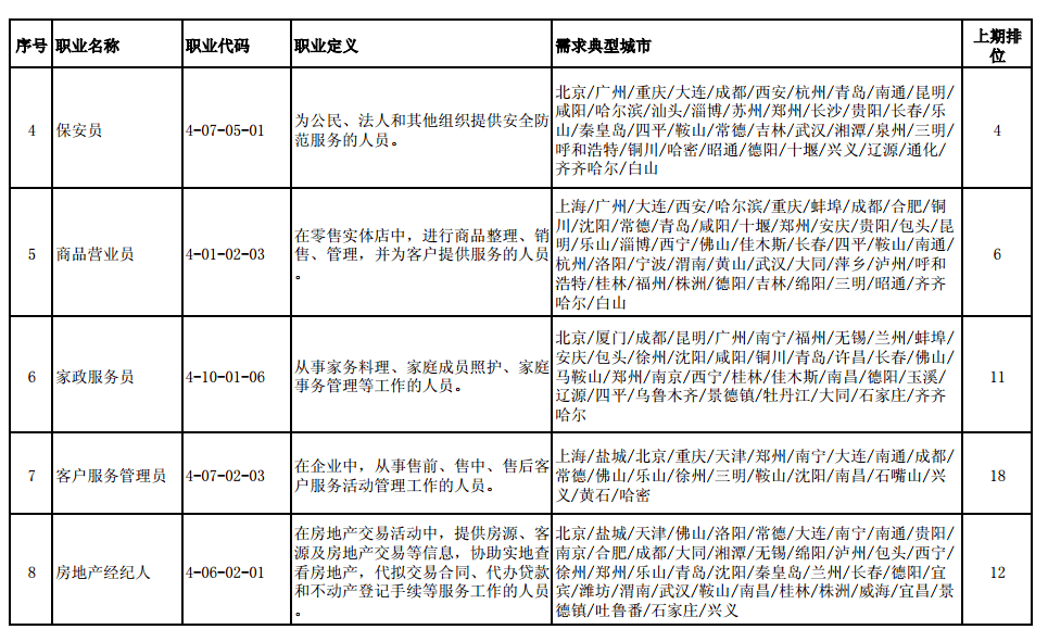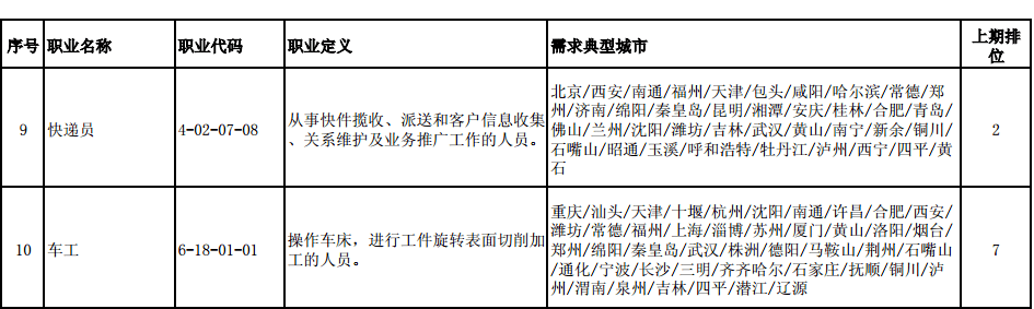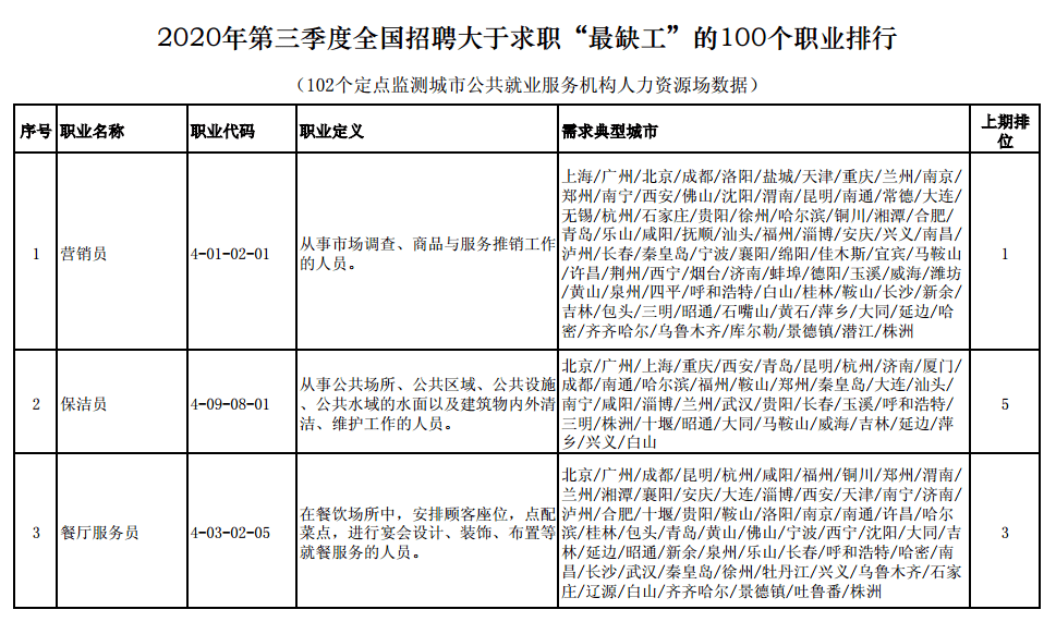 人力資源和社會保障部10月23日召開新聞發(fā)布會,發(fā)布2020年第三季度全國招聘大于求職“最缺工”的100個職業(yè)排行,排名前十的職業(yè)是:營銷員、保潔員、餐廳服務(wù)員、保安員、商品營業(yè)員、家政服務(wù)員、客戶服務(wù)管理員、房地產(chǎn)經(jīng)紀人、快遞員、車工。