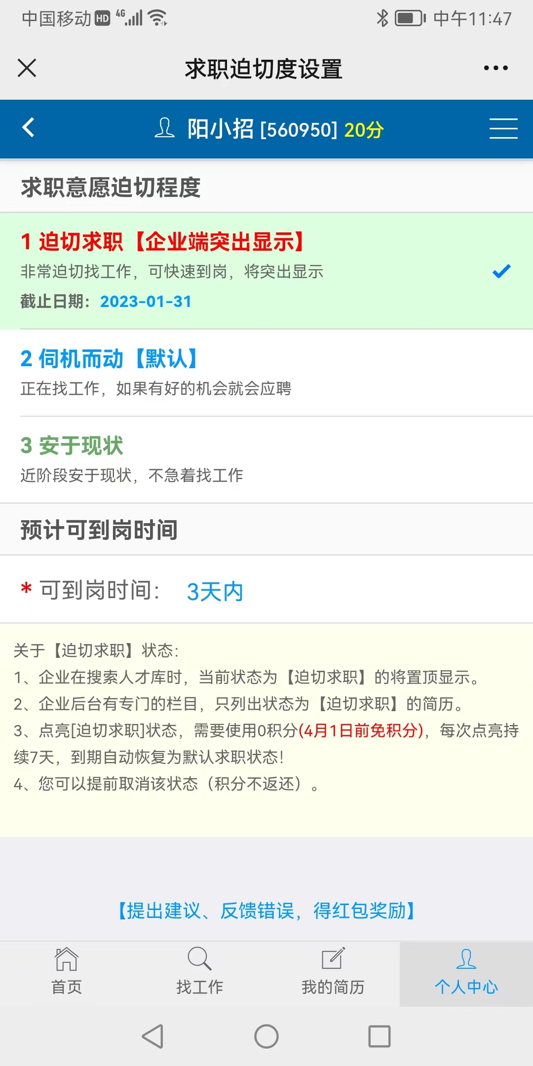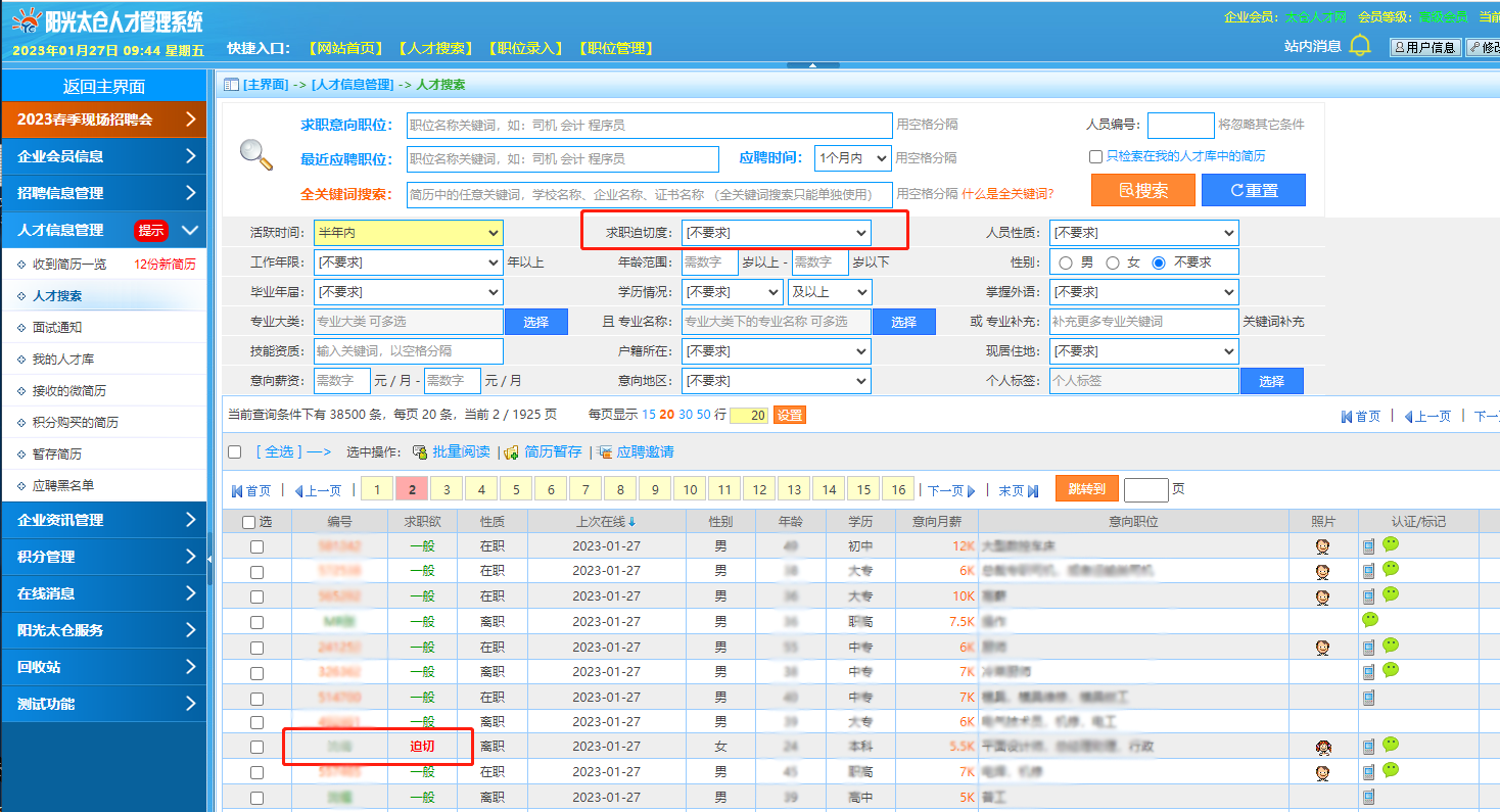 招人效率不高?看看陽光太倉人才網(wǎng)哪些求職者迫切求職中!目前陽光太倉人才網(wǎng)針對個人簡歷狀態(tài)新增了‘’求職迫切度‘’的選項,此狀態(tài)分為一般,不急及迫切。